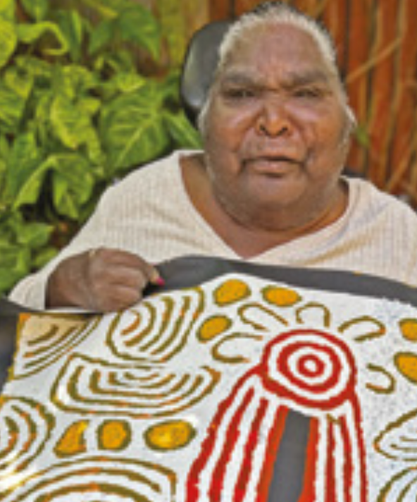 Barbara Reid Napangardi (b. 1962), of the Pintupi people, paints ancestral stories of bush food and birth ceremonies. Her works depict sacred rituals like the infant smoking ceremony, using Pintupi iconography and vivid textures. She paints sacred sites, women, and native foods through rich colour and symbol. Her bold style is internationally recognised and collected.