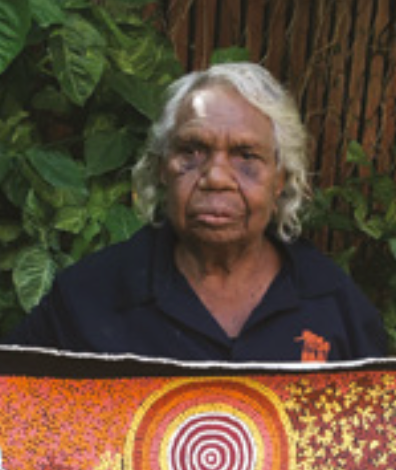Lynette Granites Nampijinpa (b. c. 1950) is a respected Warlpiri elder known for her vivid depictions of ancestral Dreamings such as Two Men, Flying Ants, and Bush Yam. Using traditional iconography, she symbolises ceremonial tools, figures, and desert landscapes. Her richly detailed paintings reflect deep cultural knowledge and are held in major collections worldwide.